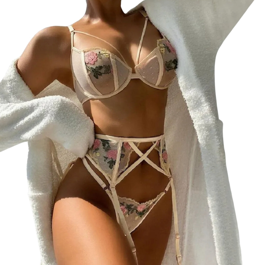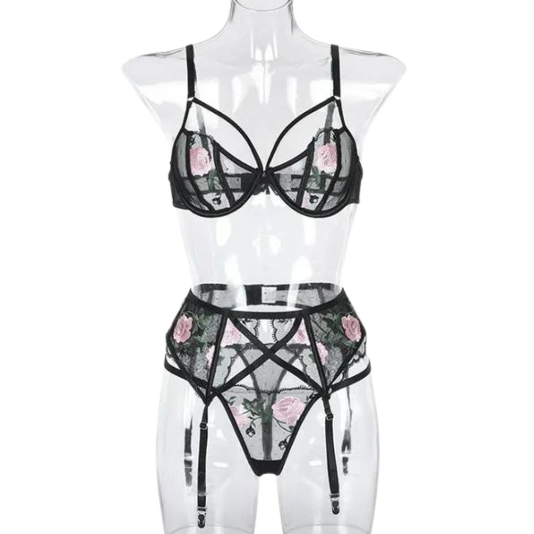 Conjunto de transparencia con detalles en flores de 3 piezas
